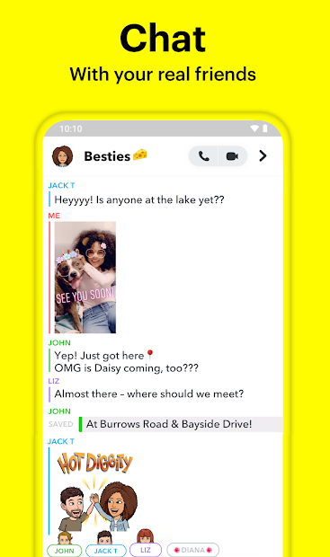 Snapchat opens right to the camera, so you can send a Snap in seconds! Just take a photo or video, add a caption, and send it to your best friends and family. Express yourself with Filters, Lenses, Bitmojis, and all kinds of fun effects.